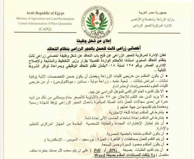 اعلنت وزارة الزراعة واستصلاح الأراضي، ممثلة في الإدارة المركزية للحجر الزراعى، عن فتح باب التعاقد عن شغل وظيفة اخصائي زراعي ثالث بنظام التعاقد السنوي.